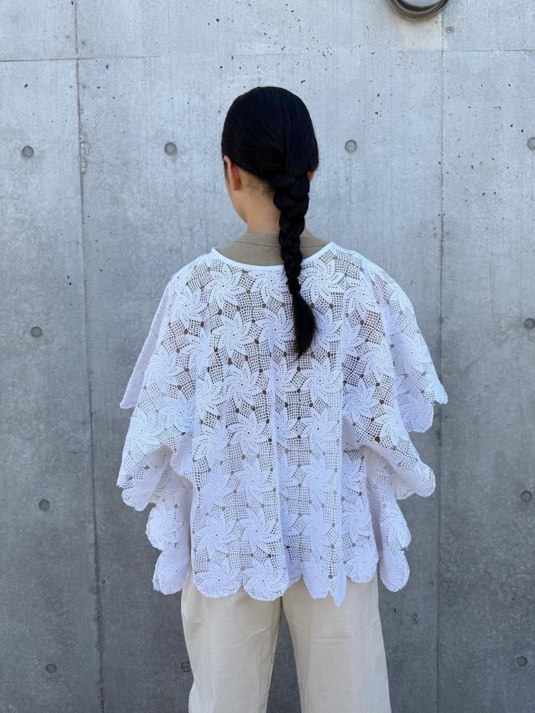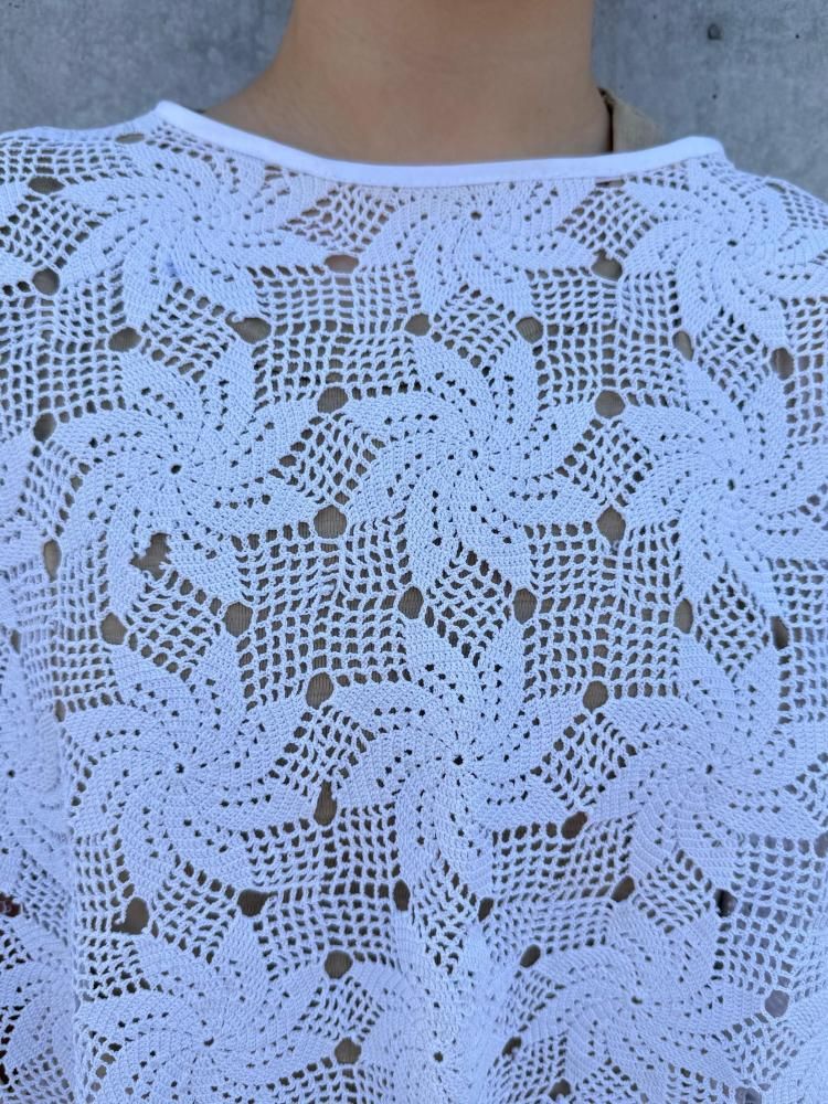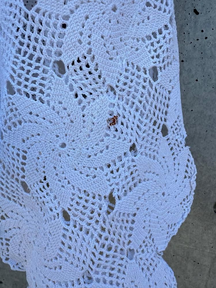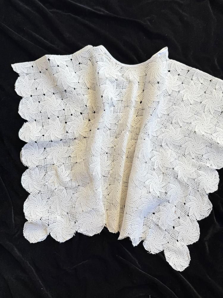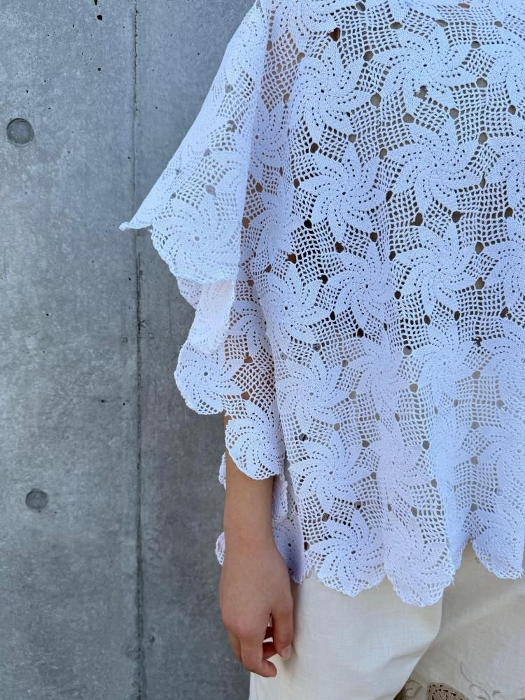 ビンテージのクロシェの生地を使って作った当店オリジナルポンチョです。ポンチョ型ですが、両サイドを縫って袖を通せるような作りにしました。画像のようにシミやほつれがありますが、着ていレバほとんど目立たナイト思います。