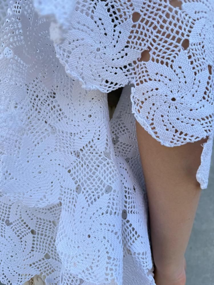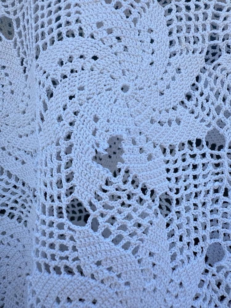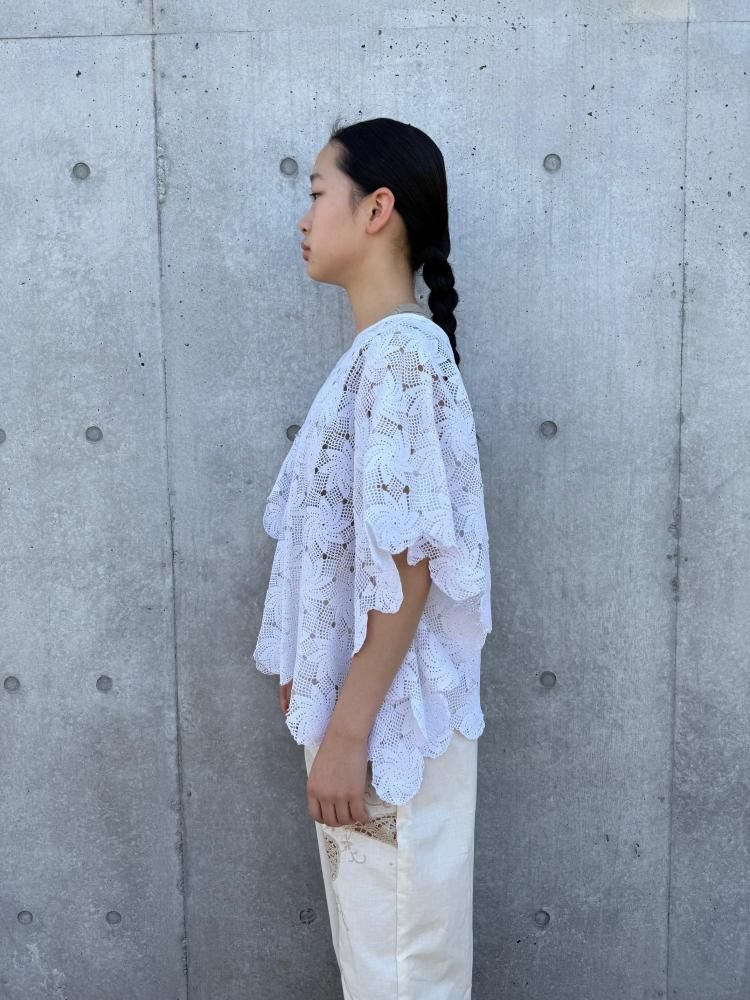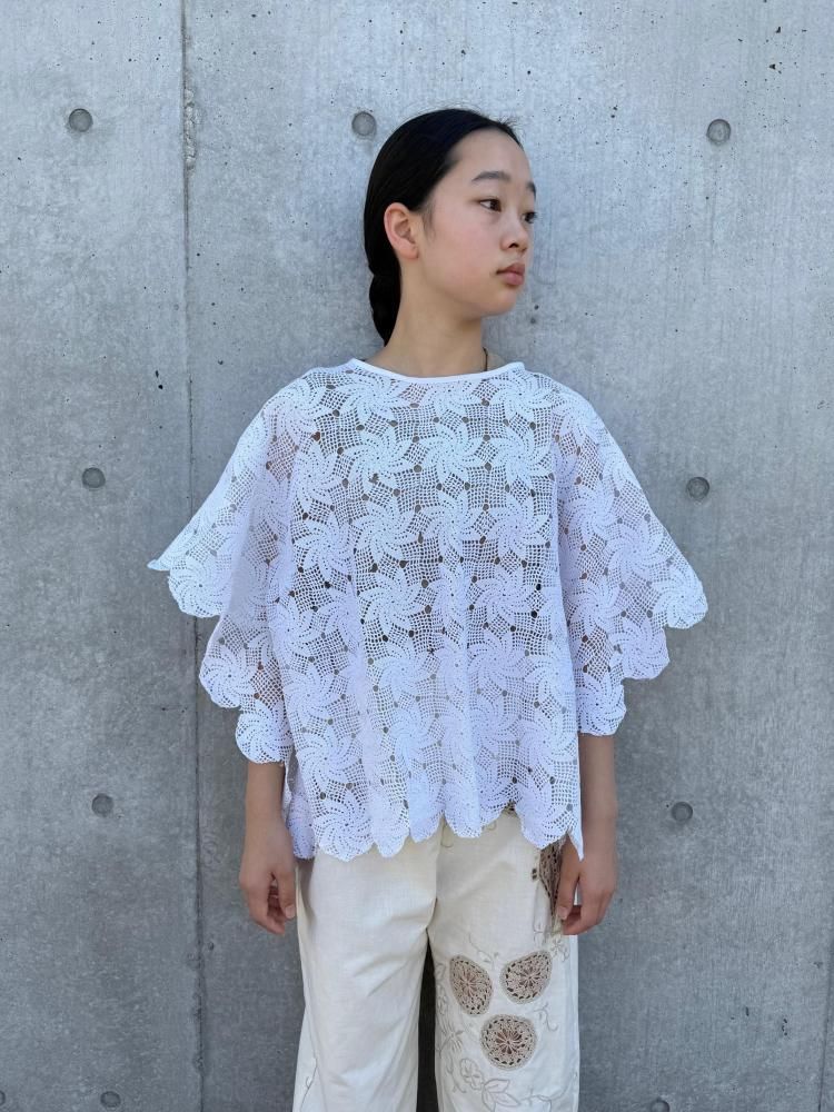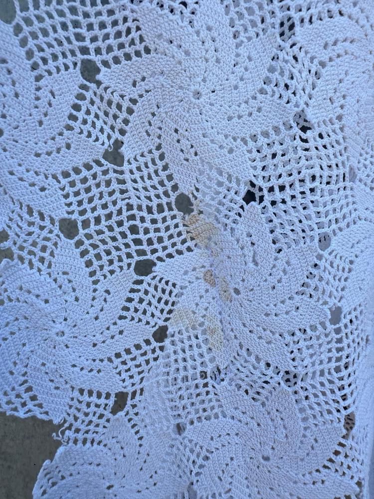 ビンテージのクロシェの生地を使って作った当店オリジナルポンチョです。ポンチョ型ですが、両サイドを縫って袖を通せるような作りにしました。画像のようにシミやほつれがありますが、着ていレバほとんど目立たナイト思います。