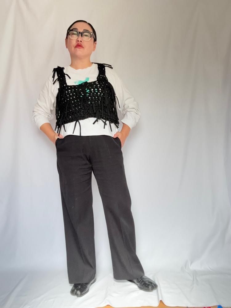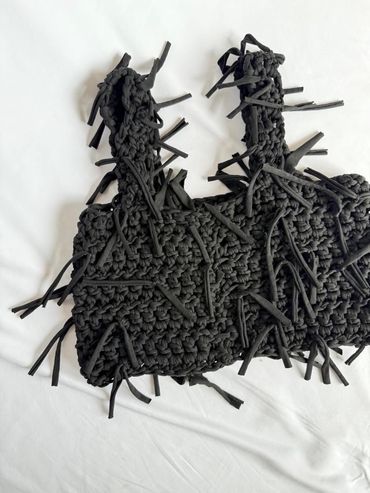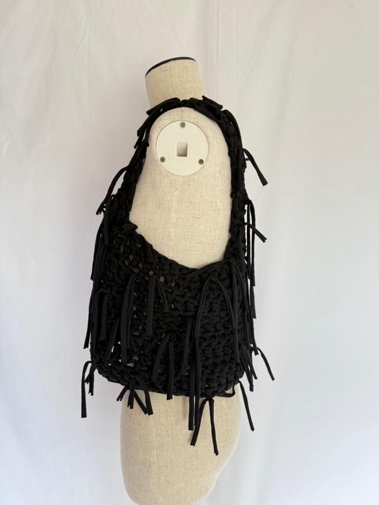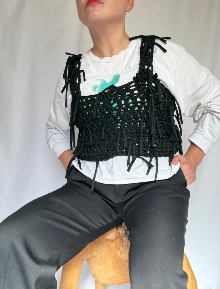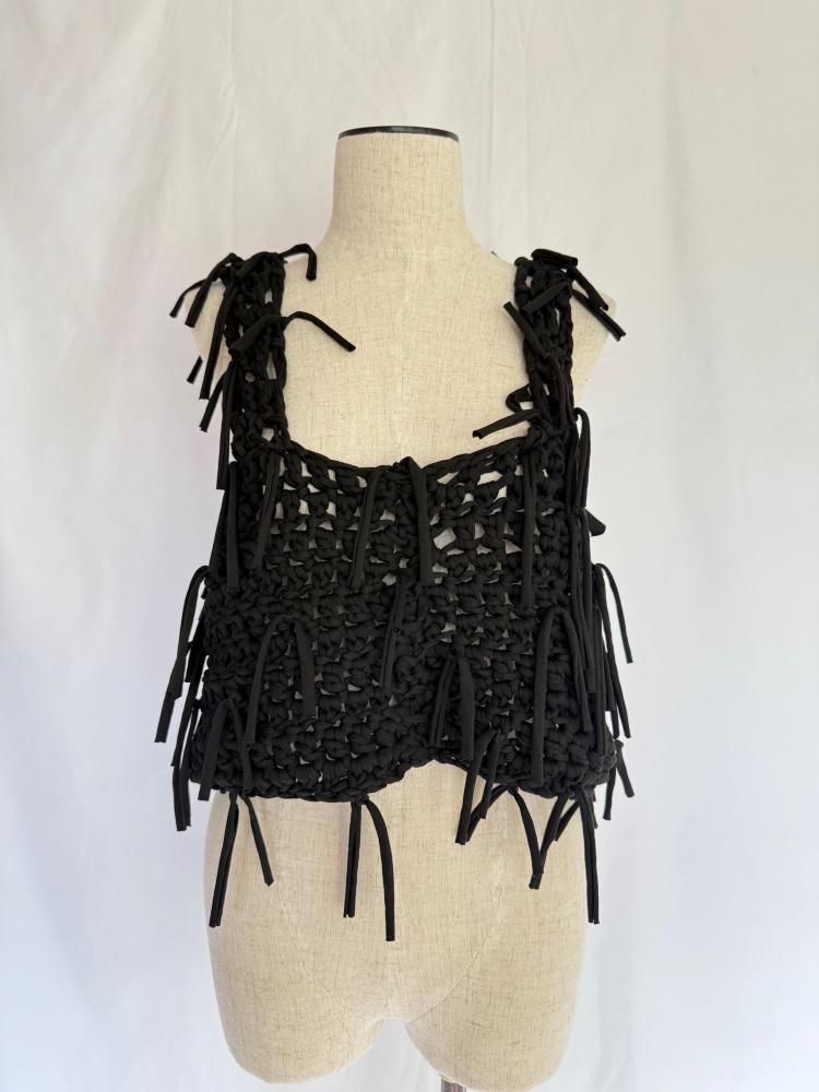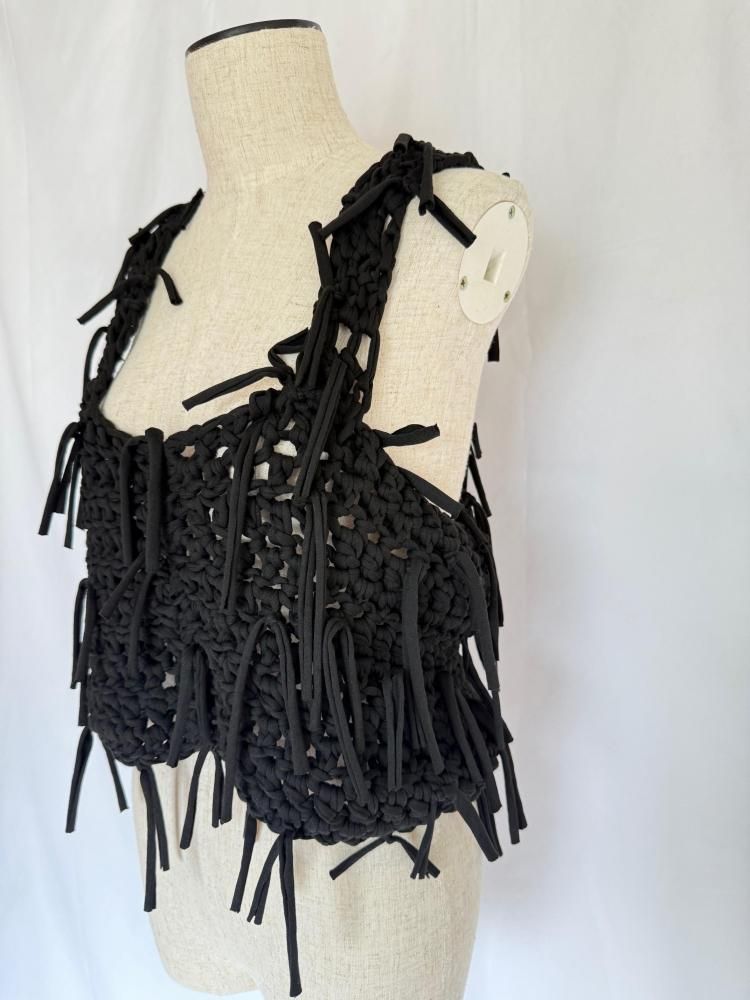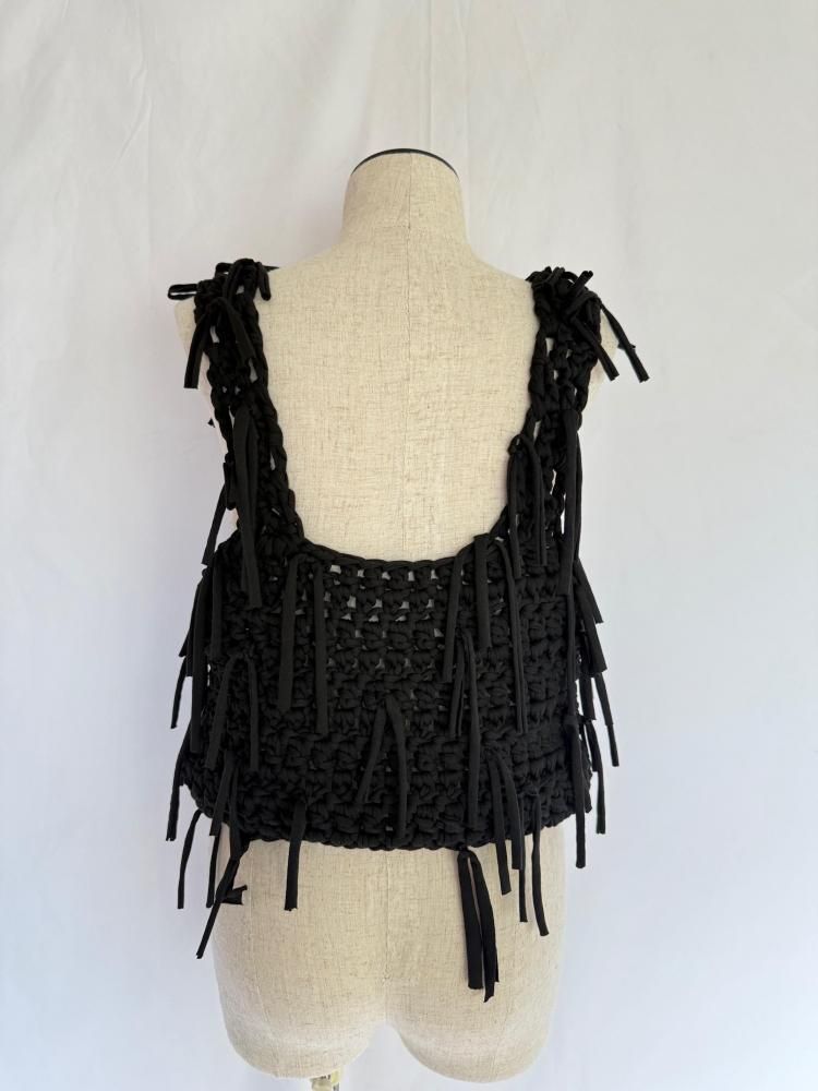 ざっくりと太い糸で編み上げた当店オリジナルトップスです。ランダムにたっぷりとフリンジを付けました。ビスチェのような感覚で重ね着にとても重宝すると思います。