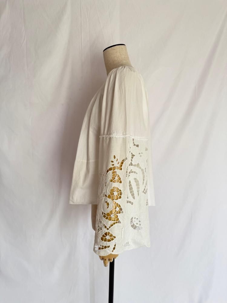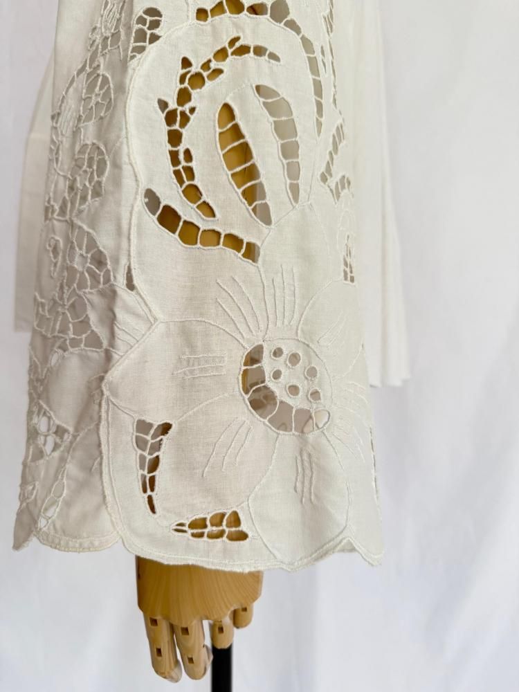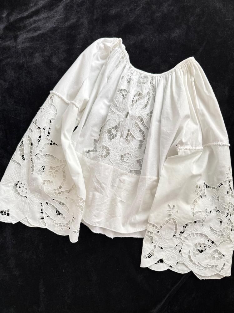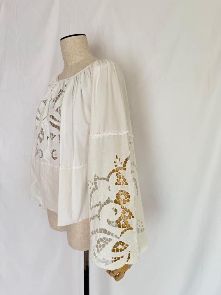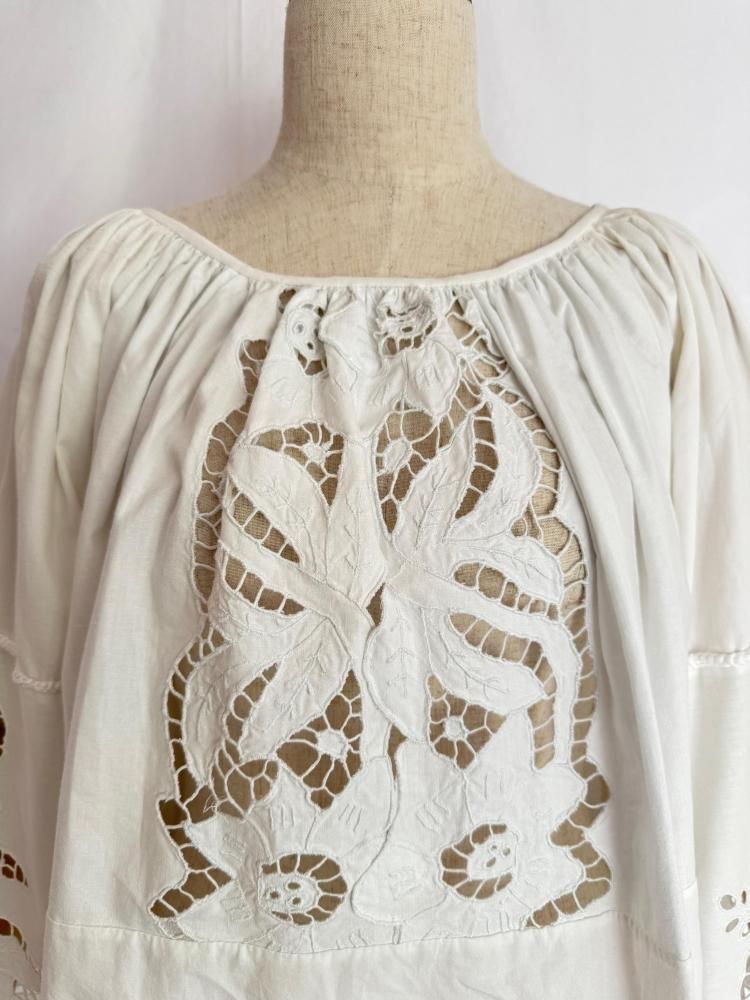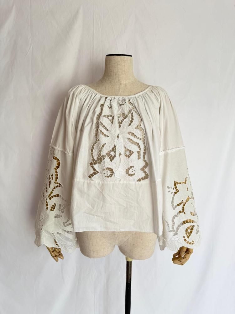 カットワークが美しいビンテージのルーマニアブラウスです。袖と胸元に施されたカットワークと広がった袖のシルエットも最高です。素材はコットン素材です。中に色物を着ると柄が浮き出るようで美しいです。