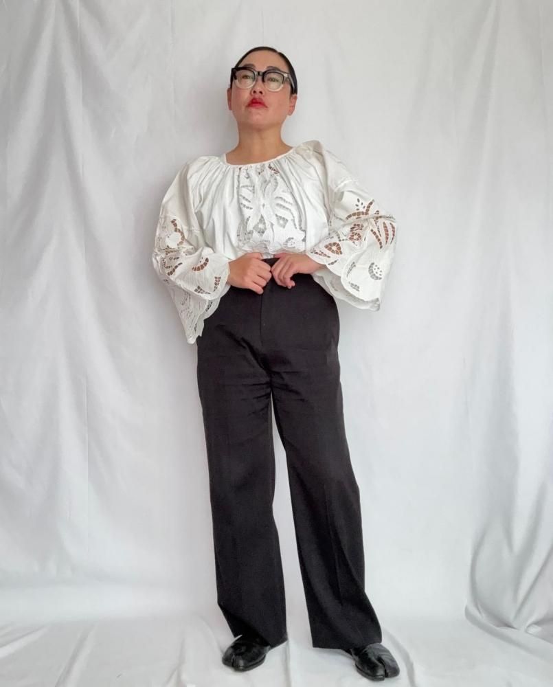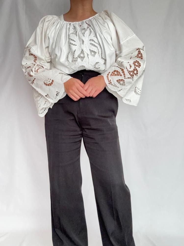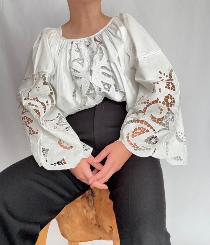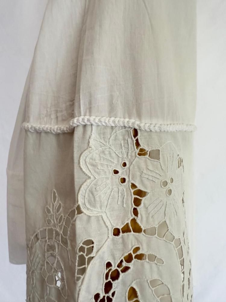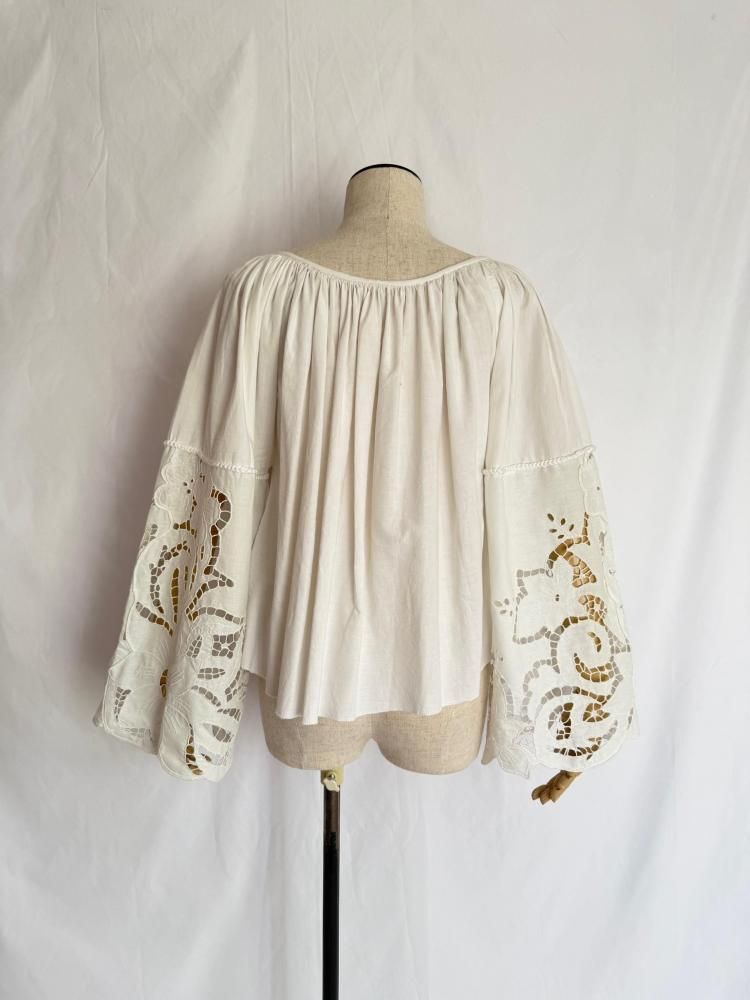 カットワークが美しいビンテージのルーマニアブラウスです。袖と胸元に施されたカットワークと広がった袖のシルエットも最高です。素材はコットン素材です。中に色物を着ると柄が浮き出るようで美しいです。
