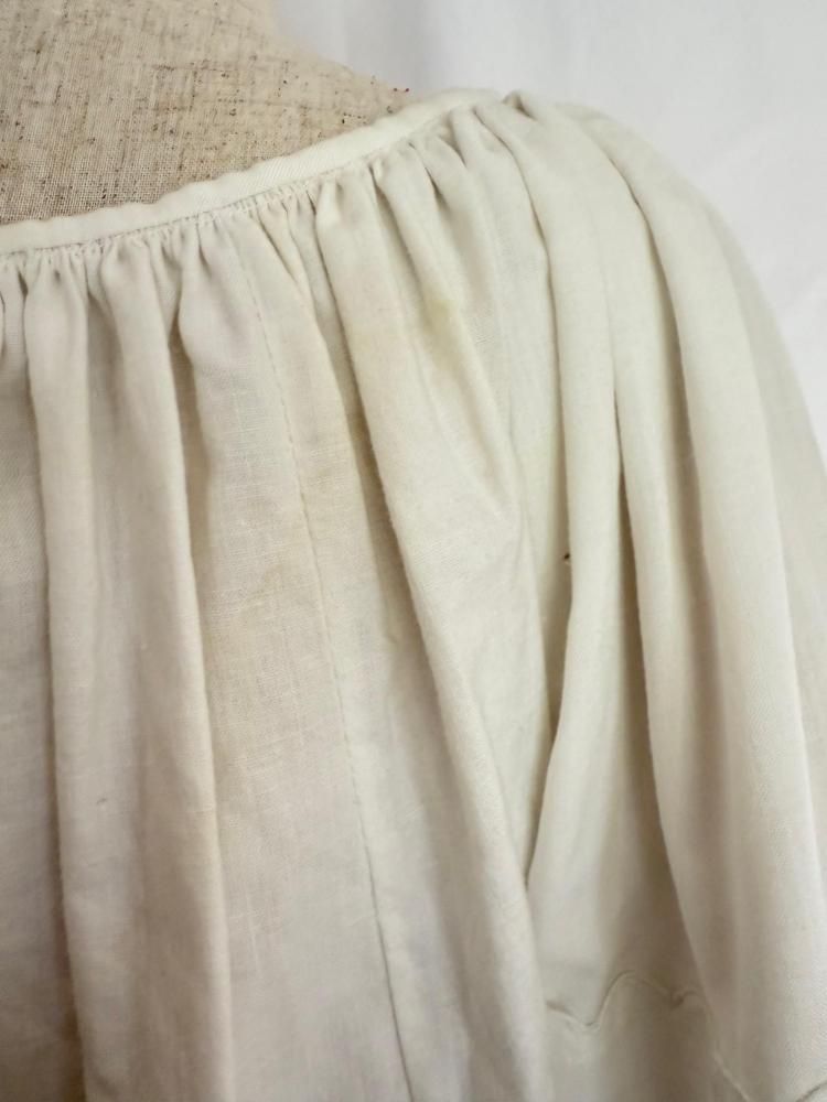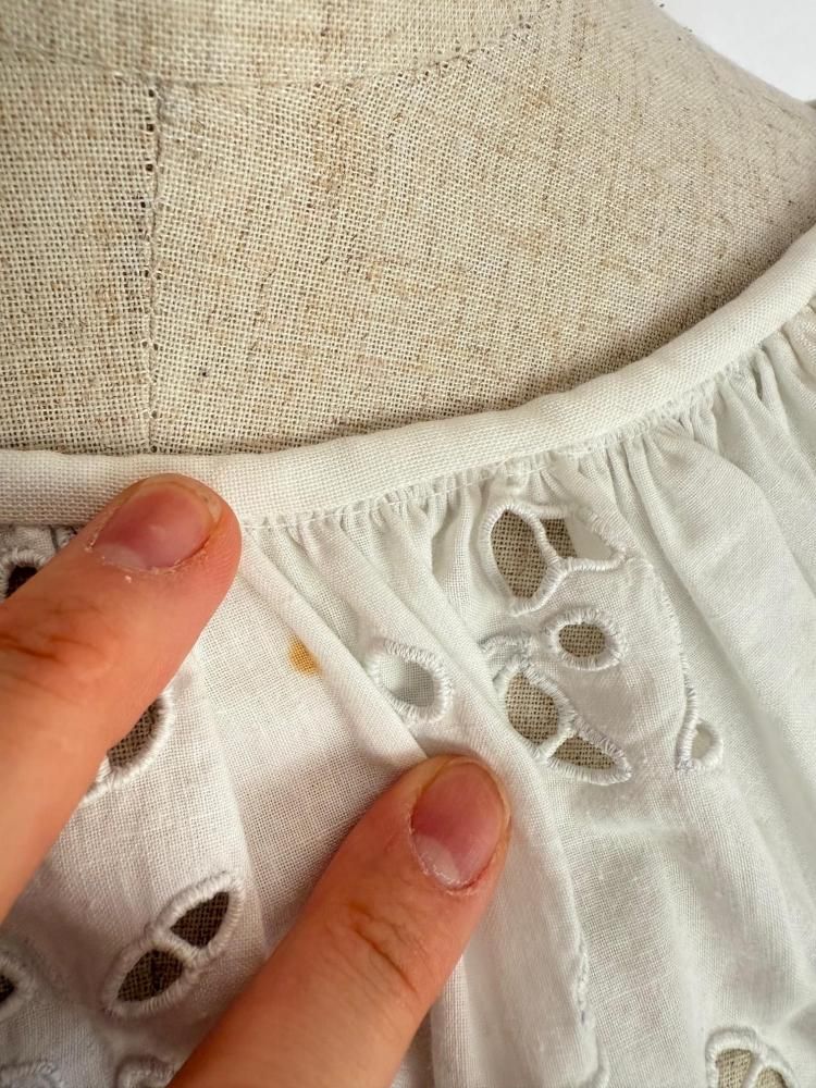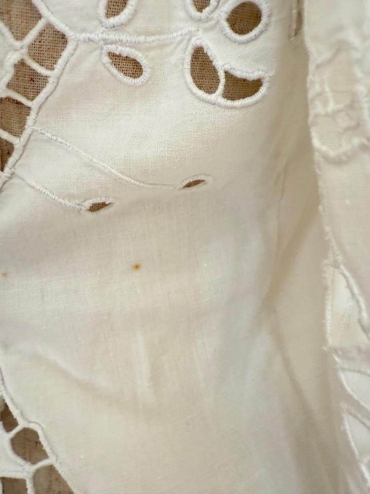 カットワークが美しいビンテージのルーマニアブラウスです。袖と胸元に施されたカットワークと広がった袖のシルエットも最高です。素材はコットン素材です。中に色物を着ると柄が浮き出るようで美しいです。画像のようにマイナーな汚れがありますが、着ているとほとんど気にならないと思います。