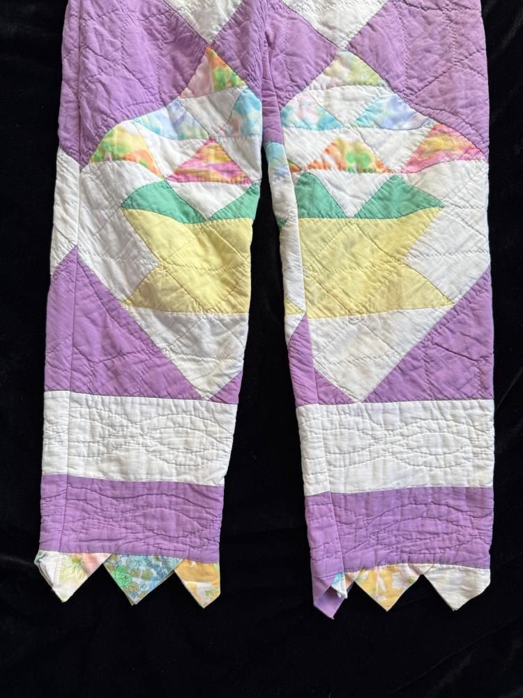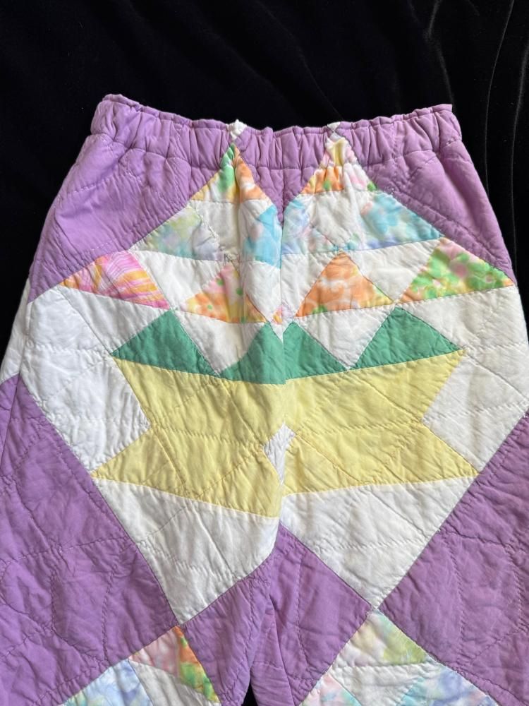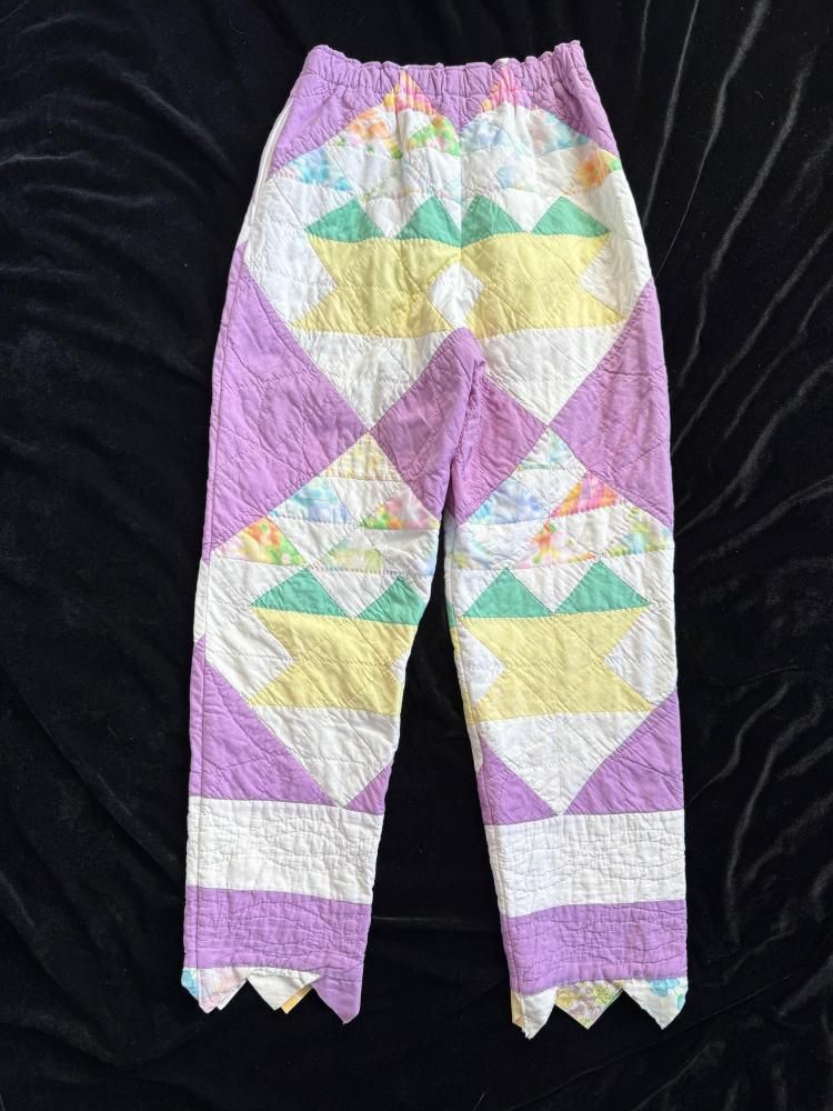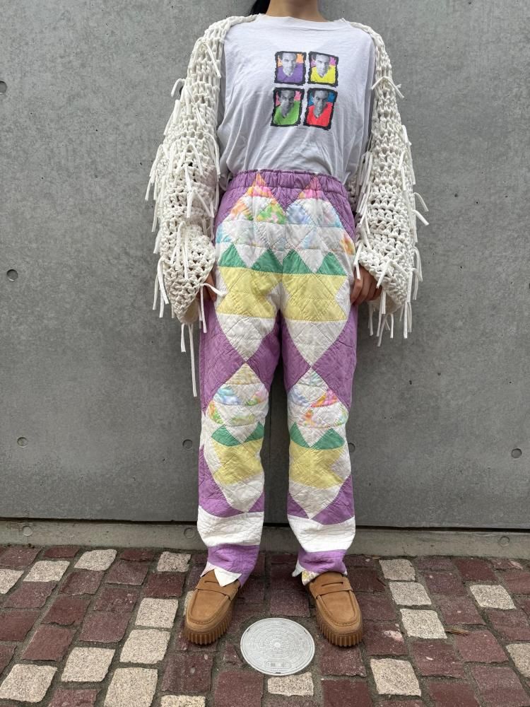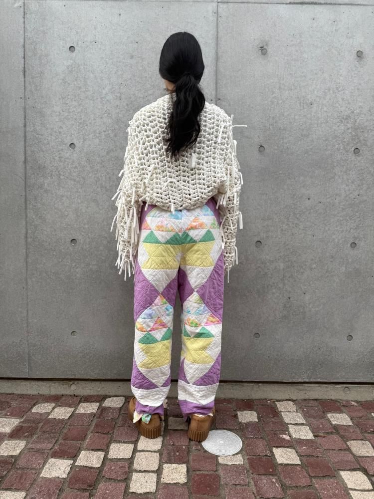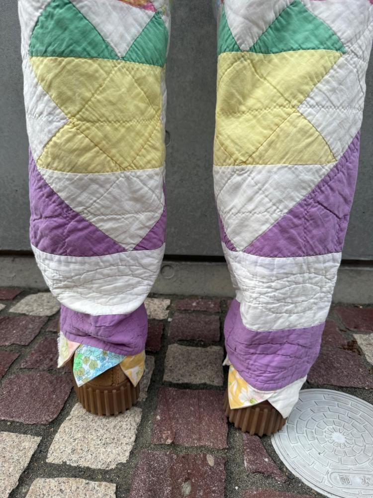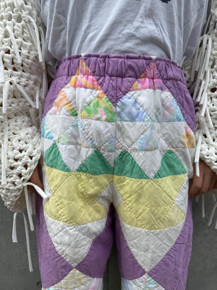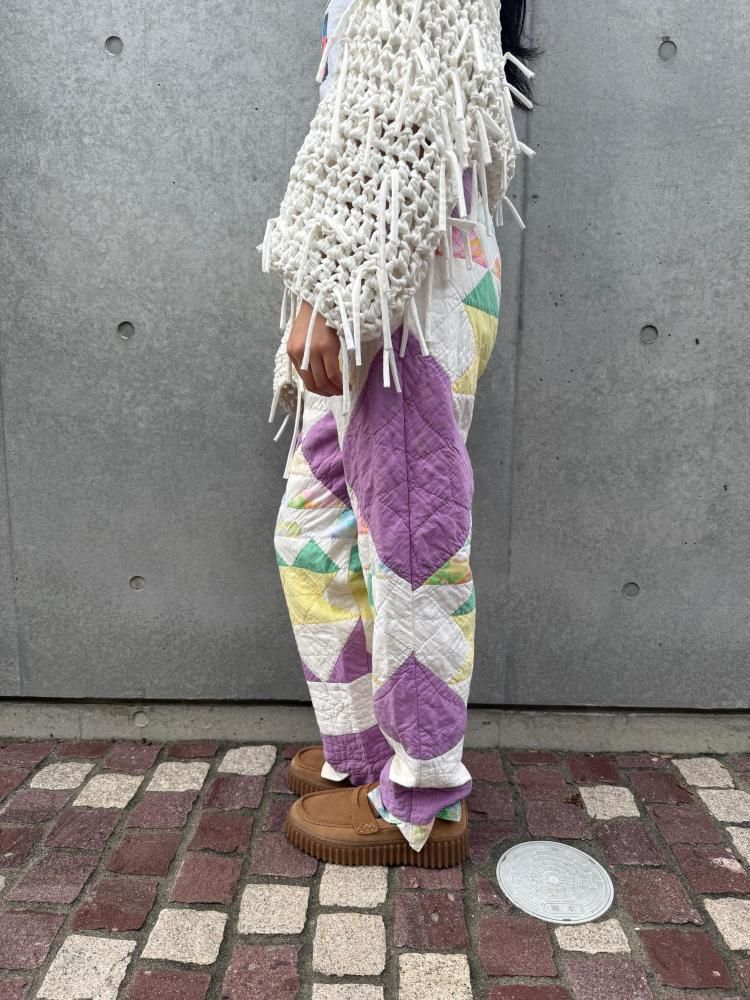 ビンテージのパッチワークキルトを使って作られたシルエットがとても綺麗なパンツです。パステルトーンの色合いが綺麗で裾のギザギザとしたカッティングもポイントになっています。