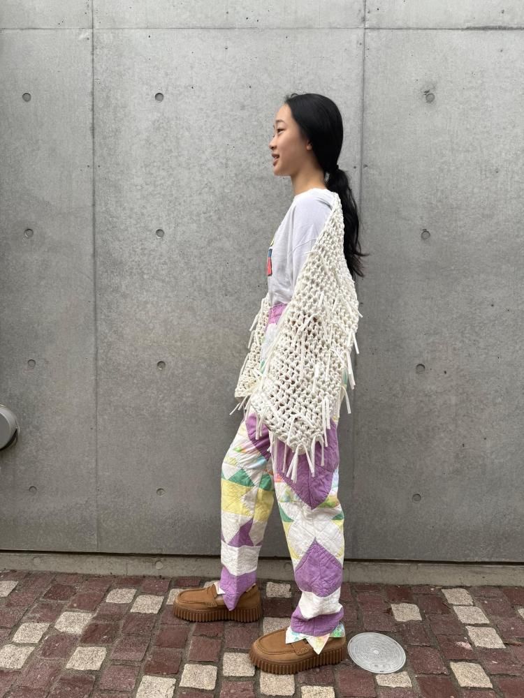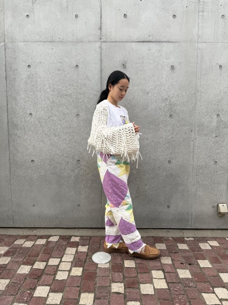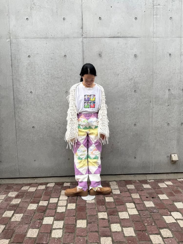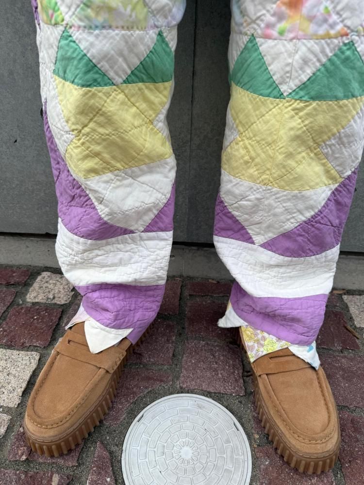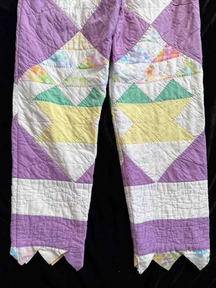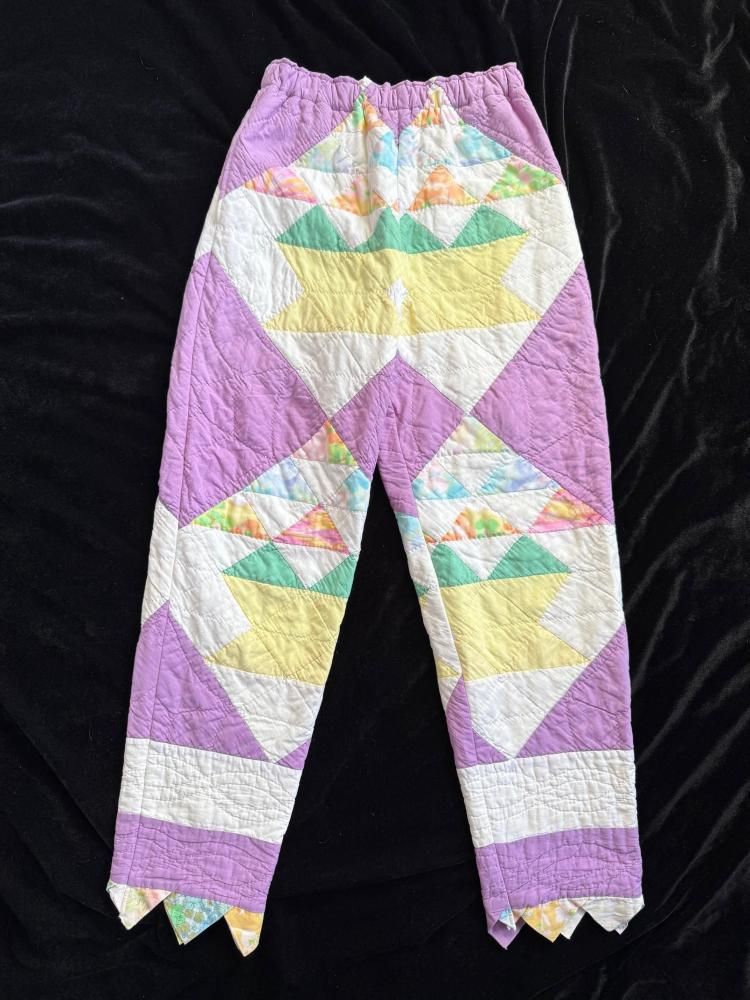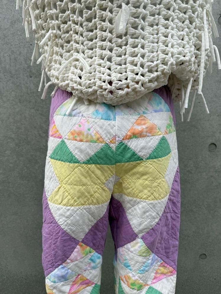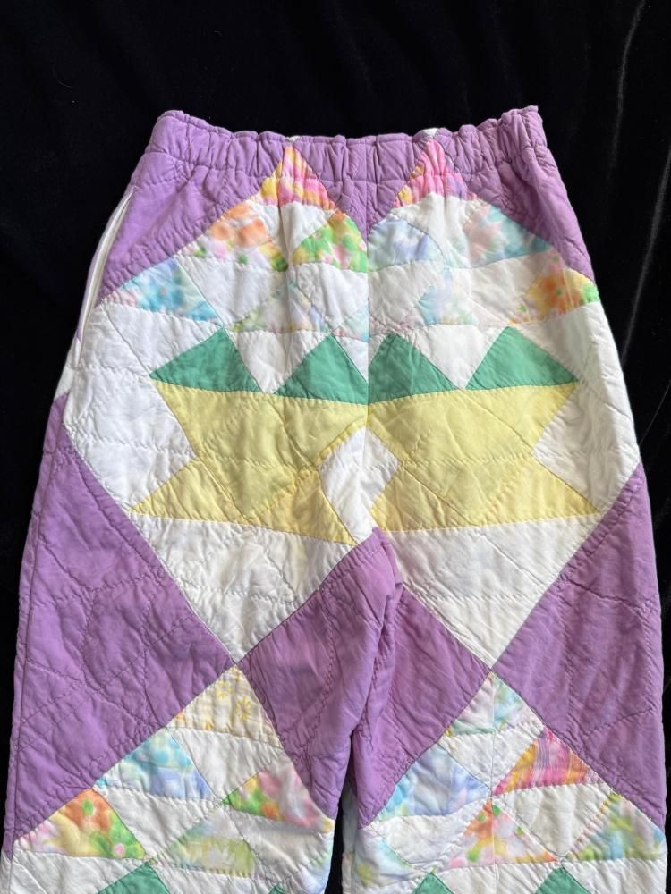 ビンテージのパッチワークキルトを使って作られたシルエットがとても綺麗なパンツです。パステルトーンの色合いが綺麗で裾のギザギザとしたカッティングもポイントになっています。