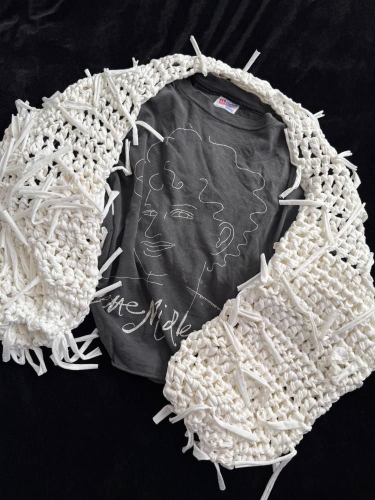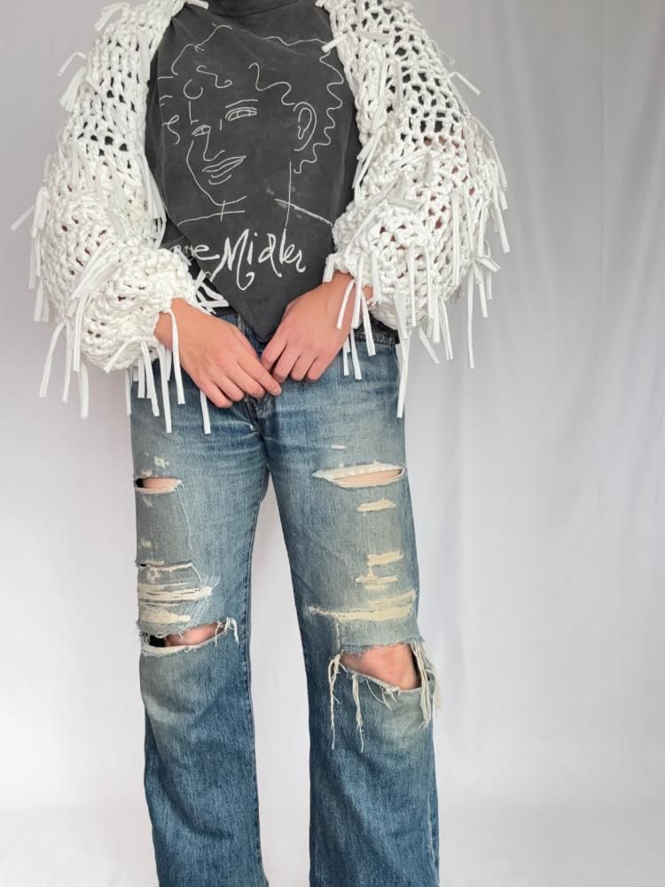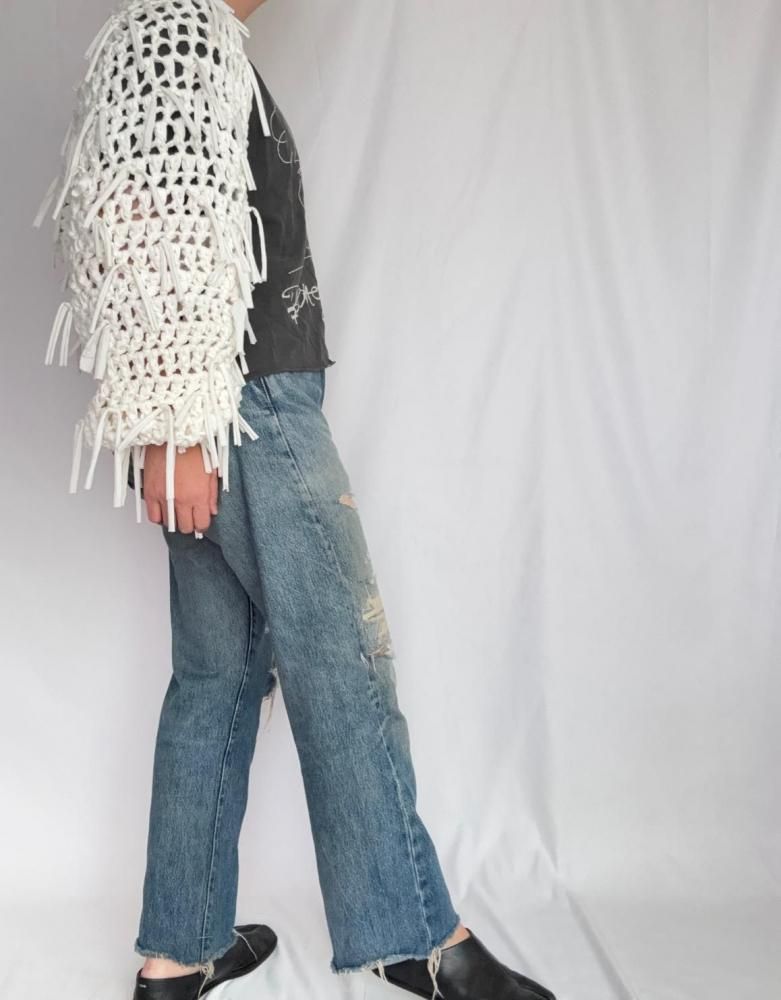 Tシャツヤーンを使った編み上げた当店オリジナルカーディガンです。ざっくりと編み上げ、フリンジをたっぷりと付けました。袖口にはゴムを入れてあります。