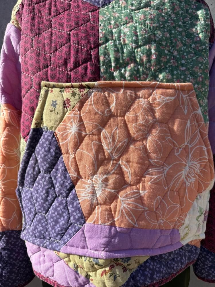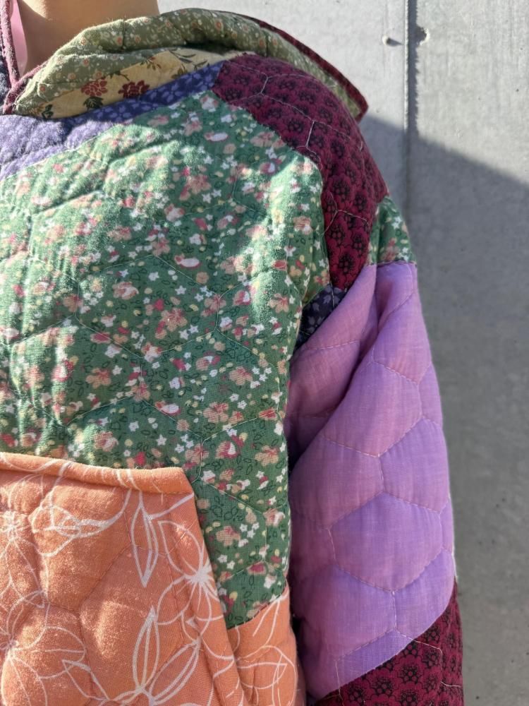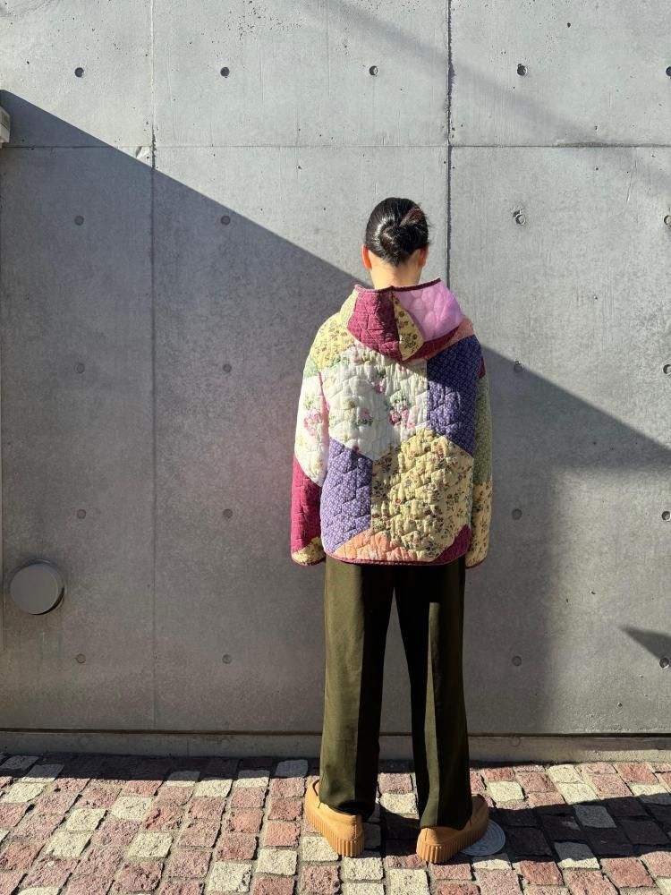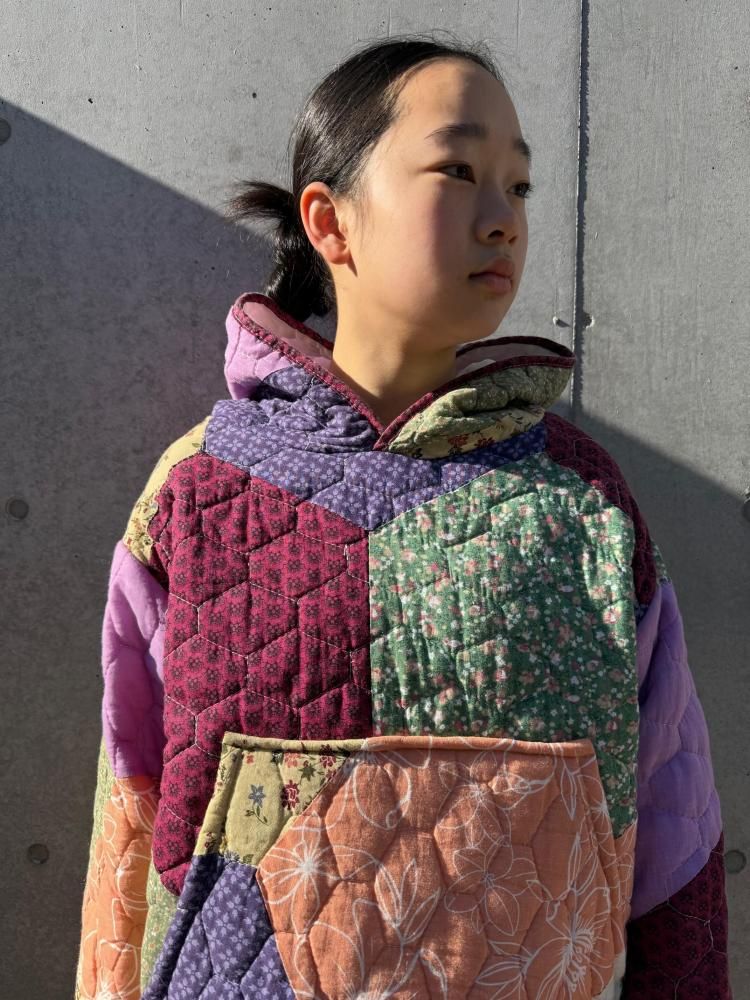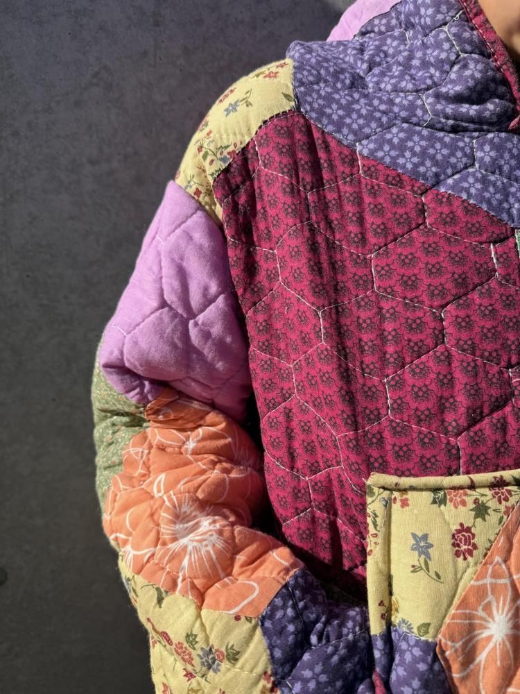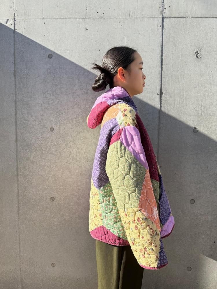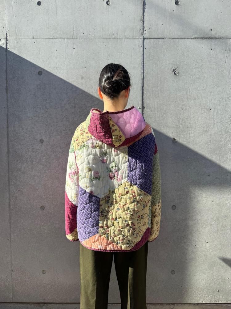 ビンテージキルトを使って作られたプルオーバーフーディーです。大きめのサイズ感で中にスウェットやニットも着れると思います。上からコート羽織っても可愛いです。フロントに大きなポケットが縫われています。